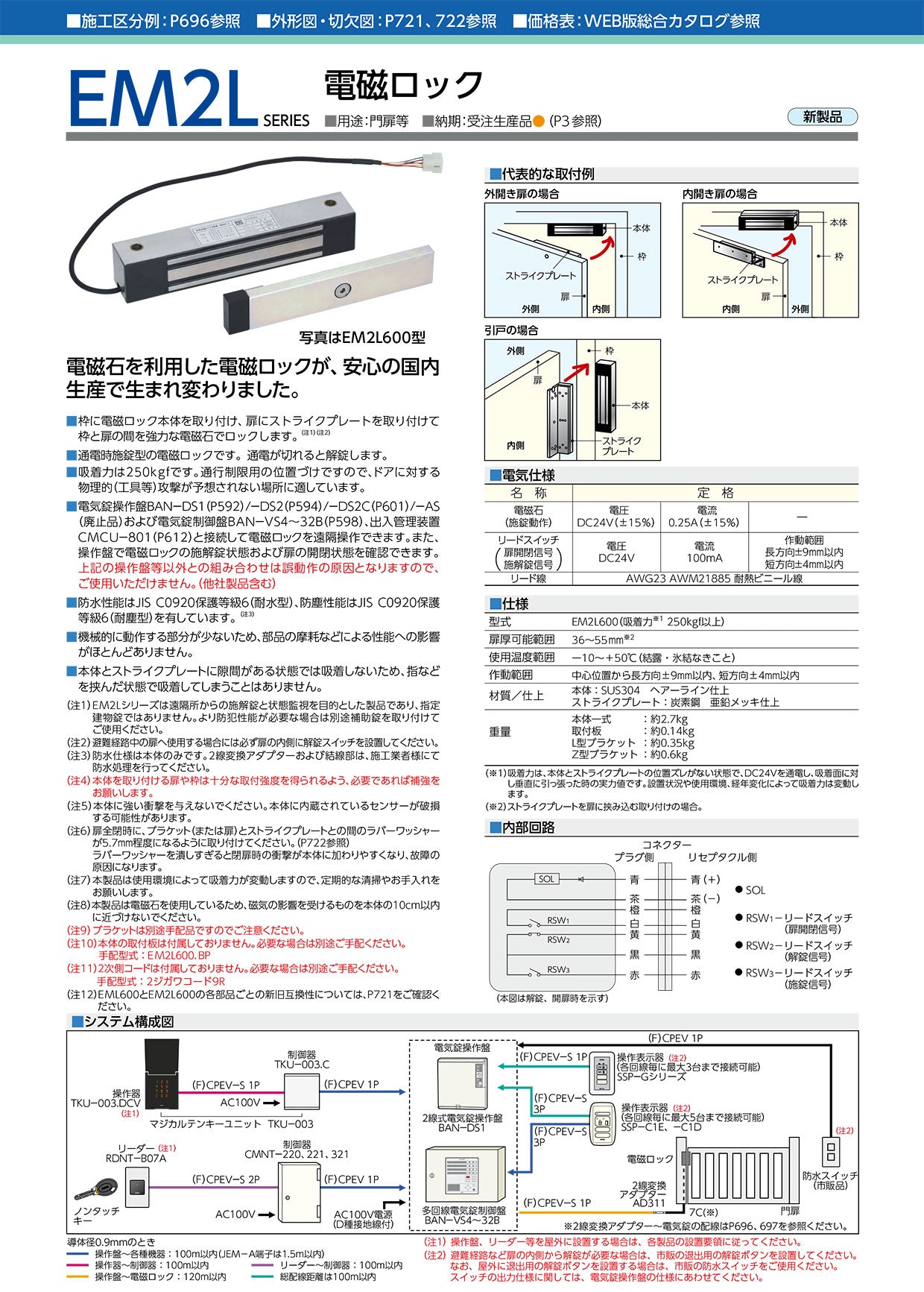 ■電気錠操作盤BANーDS1(P592)/ーDS2(P594)/ーDS2C(P601)/ーAS (廃止品)および電気錠制御盤BANーVS4~32B(P598)、出入管理装置CMCUー801(P612)と接続して電磁ロックを遠隔操作できます。また、操作盤で電磁ロックの施解錠状態および扉の開閉状態を確認できます。上記の操作盤等以外との組み合わせは誤動作の原因となりますので、 ご使用いただけません。(他社製品含む)